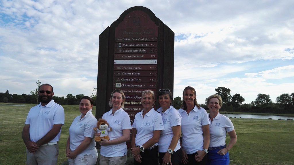 L’équipe est composée de gauche à droite: Alexandre Delhomme (pro), Emilie Barraud, Claire Weiss (capitaine), Florence Brissaud, Christine Moulies, Séverine Jouy, et Barbara Eyraud sans oublier la mascotte de l’Ecole de Golf « Balter ».